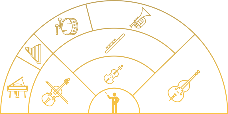 An orchestra: a coordinated set of sounds, tools, people, artists who can give voice and shape to whatever sequence of chords, notes, words, also thanks to the different nuances of the sound of the instruments that make it up.
